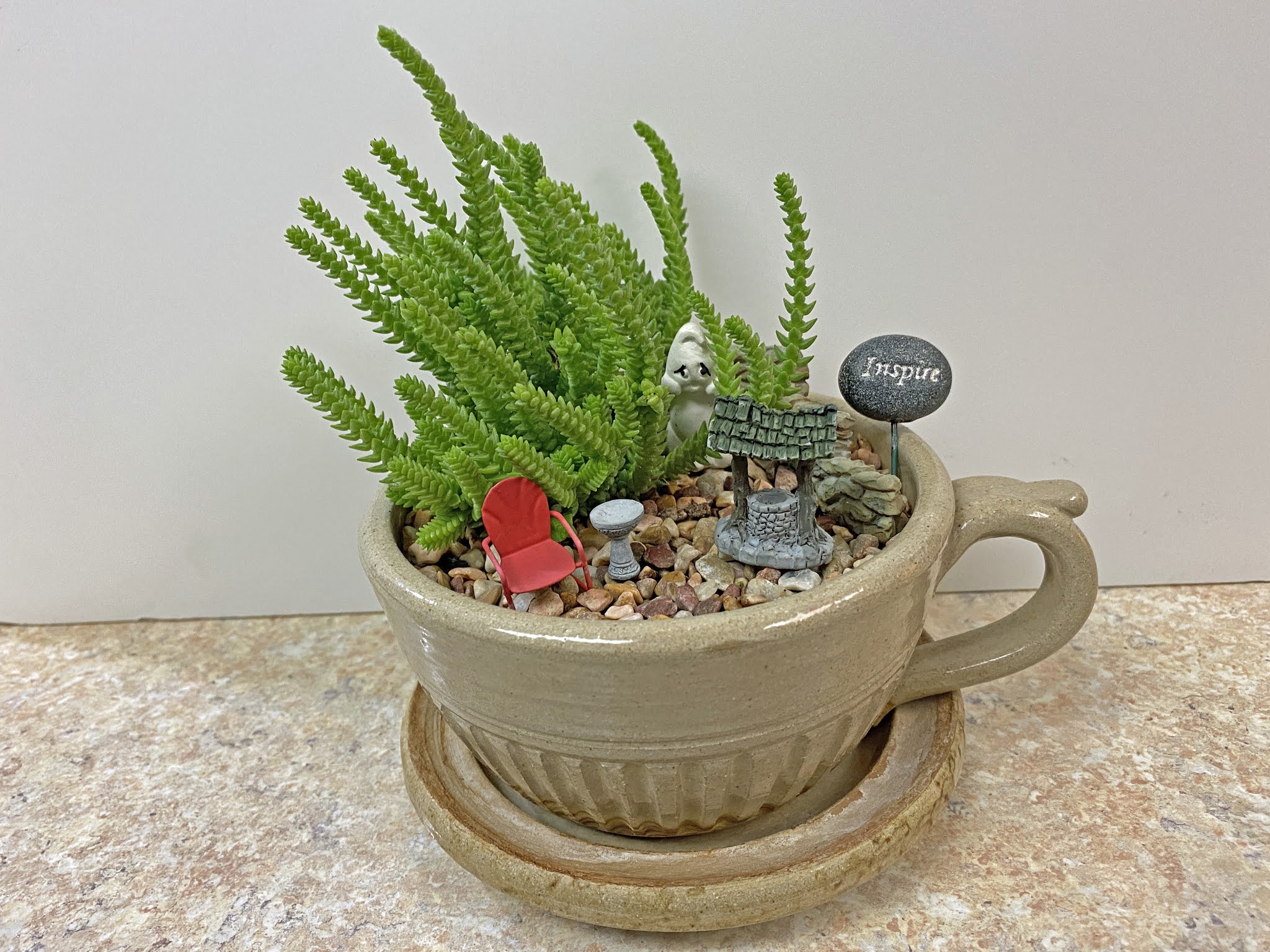I usually have one or two mini fairy gardens on my table but decided the older ones are a bit overgrown and I was ready for a change for awhile! I've loved this one as a memory of our AZ Snowbird years. Looks like a little ghost has slipped into the scene as it came indoors!